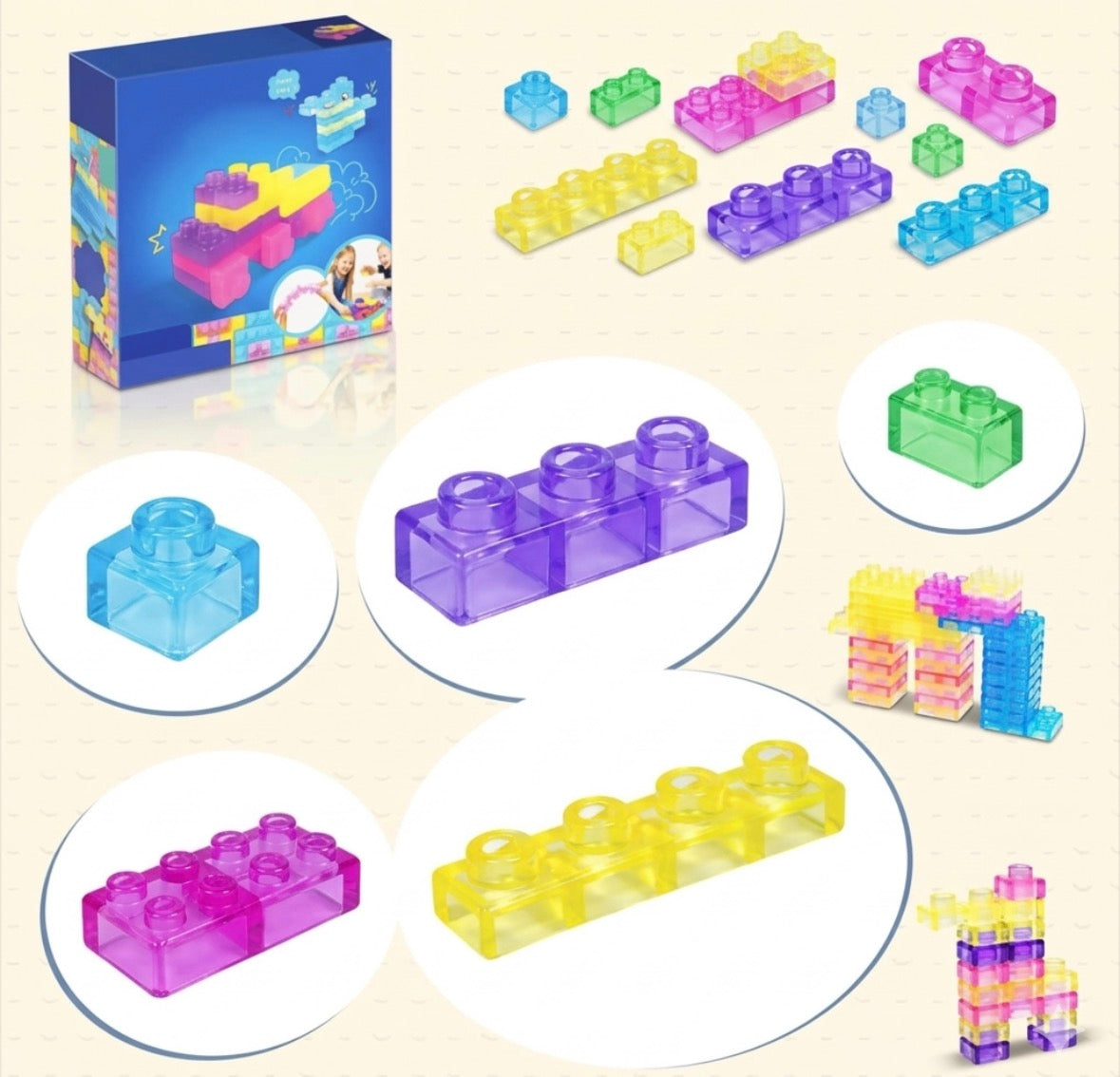 Klocki mają różne kształty i kolory, co dodatkowo pobudza wyobraźnię i zachęca do zabawy.
